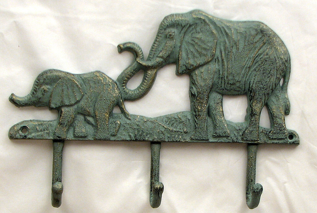 Cast Iron elephant and her calf hook. Great addition to any room with 3 hooks for coats, hats, leashes, etc and the trunks are up for good luck. Measures: 11 1/2"W x 8"H x 1 7/8"D.