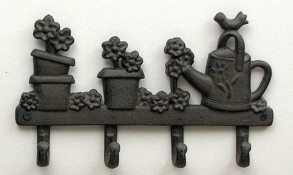 Cast Iron Flower/ Watering Can Hooks, gardeners hook in antiques green gold color. Measures 10.5"W x 6.25"H x 1.5"D.