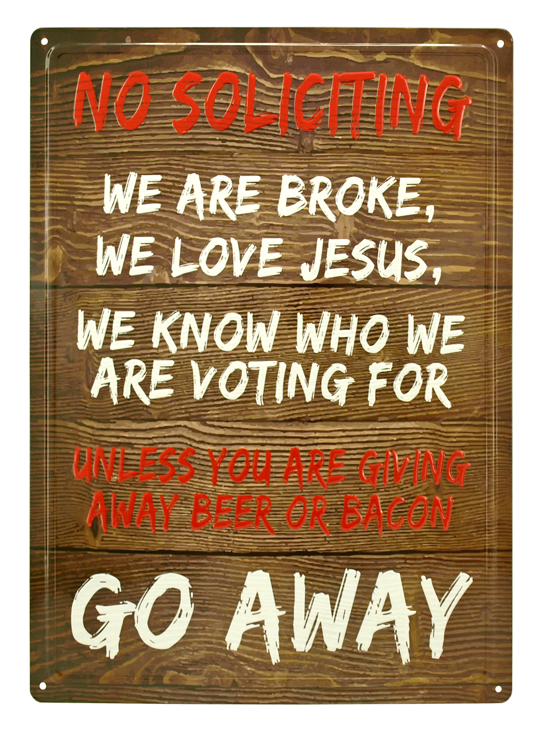 NO SOLICITING - We are Broke, We Love Jesus, We know who We Are Voting For.. Unless you are giving away Beer or Bacon GO AWAY!